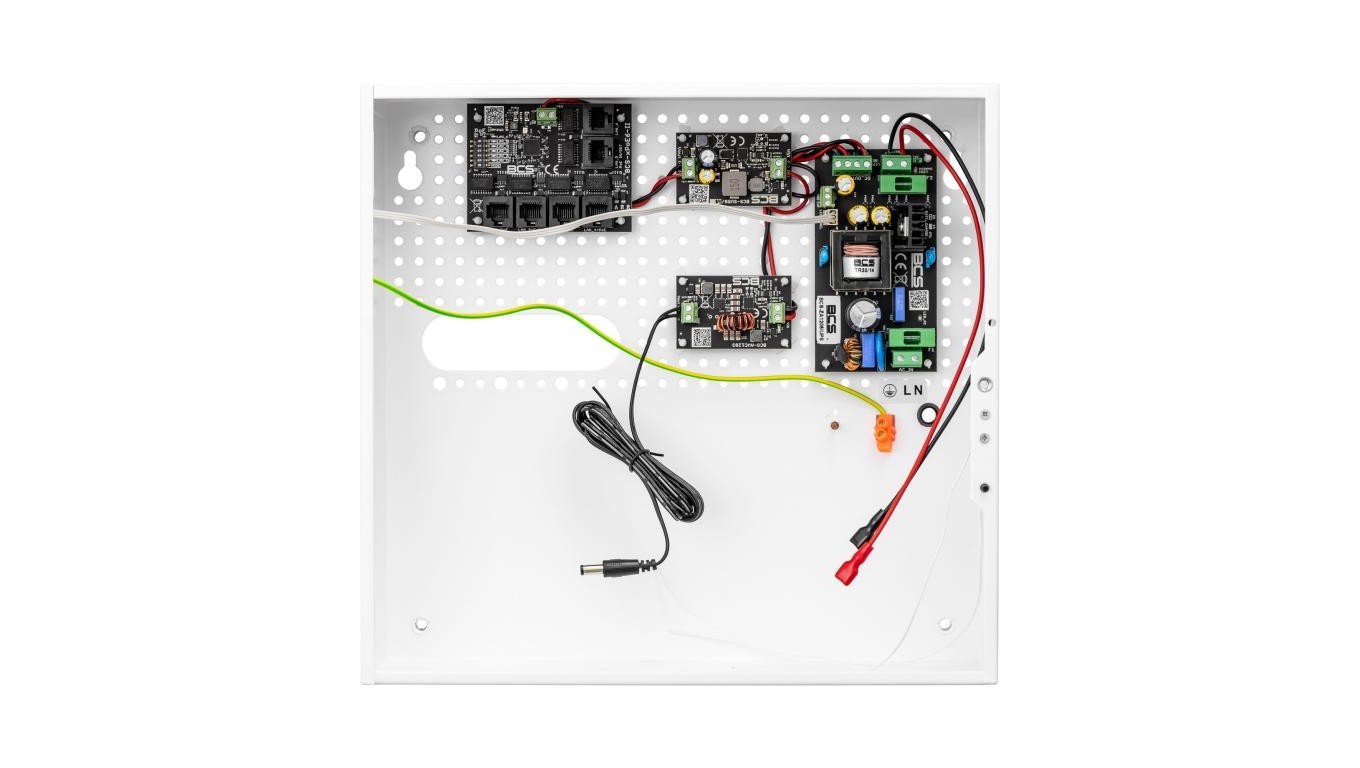 Obudowa BCS-F, Materiał obudowy - blacha stalowa 0,8 mm, Obudowa malowana proszkowo na kolor biały, Zamontowany tamper otwarcia, Systemowe otworowanie 4,8 mm w rastrze 10,8 mm, Dystans do ściany, Otwory montażowe 6 mm
