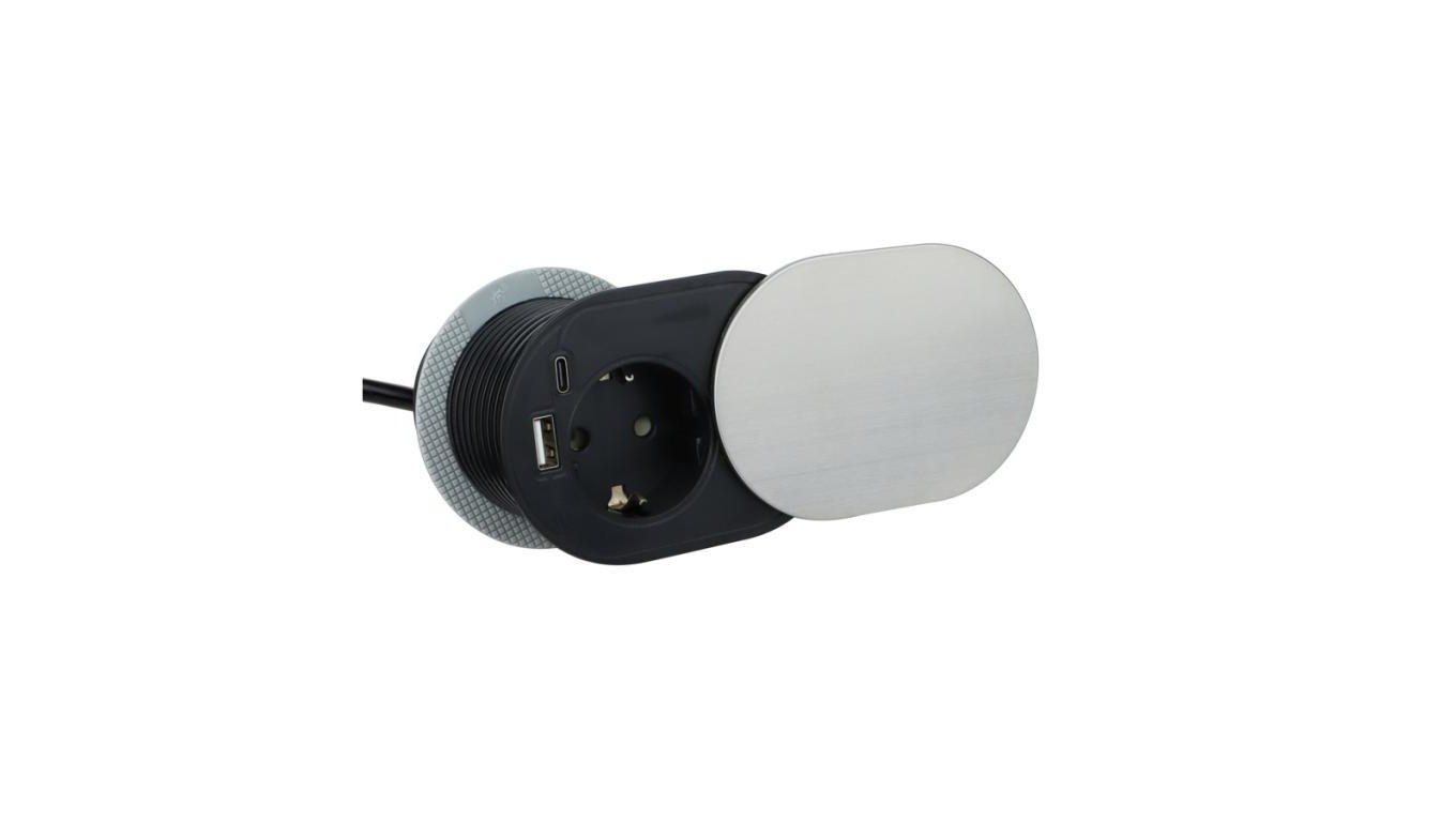 Gniazdo meblowe chowane w blat SLIDE BOX okrągłe aluminiowe pojedyncze 1x 2P+Z Schuko 16A + gniazdo ładowania 1x USB A 1x USB C