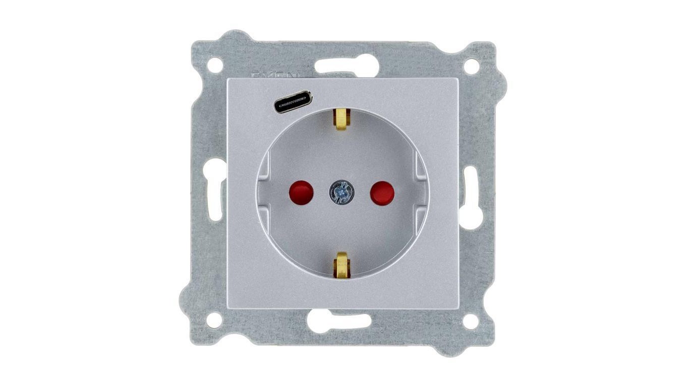 Gniazdo z uziemieniem Schuko 2P+E i przesłonami torów prądowych + gniazdo Typ C Srebrny 274/10E EXEN