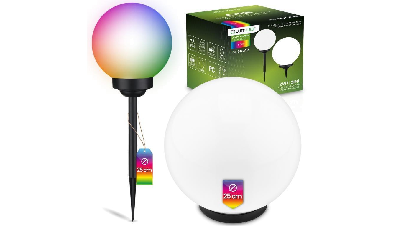 Lampa Solarna Ogrodowa LED ATRIS Wbijana Naziemna Biała Kula 25cm RGB LUMILED