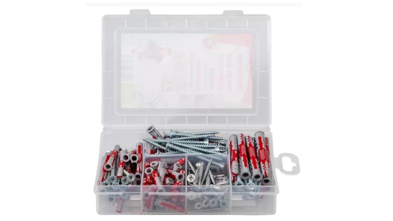 MIX Kołki rozporowe uniwersalne w pudełku DuoPower 6x30, 6x50, 8x40, 8x65 z wkrętem z łbem stożkowym PZ 150 elementów PROFI-BOX