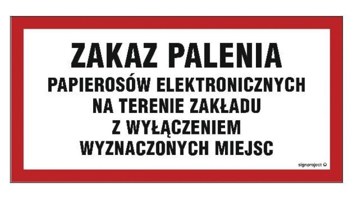 NC097 Zakaz palenia papierosów elektronicznych na terenie zakładu z wyłączeniem wyznaczonych miejsc 20 x 10 cm PN - Płyta 1mm