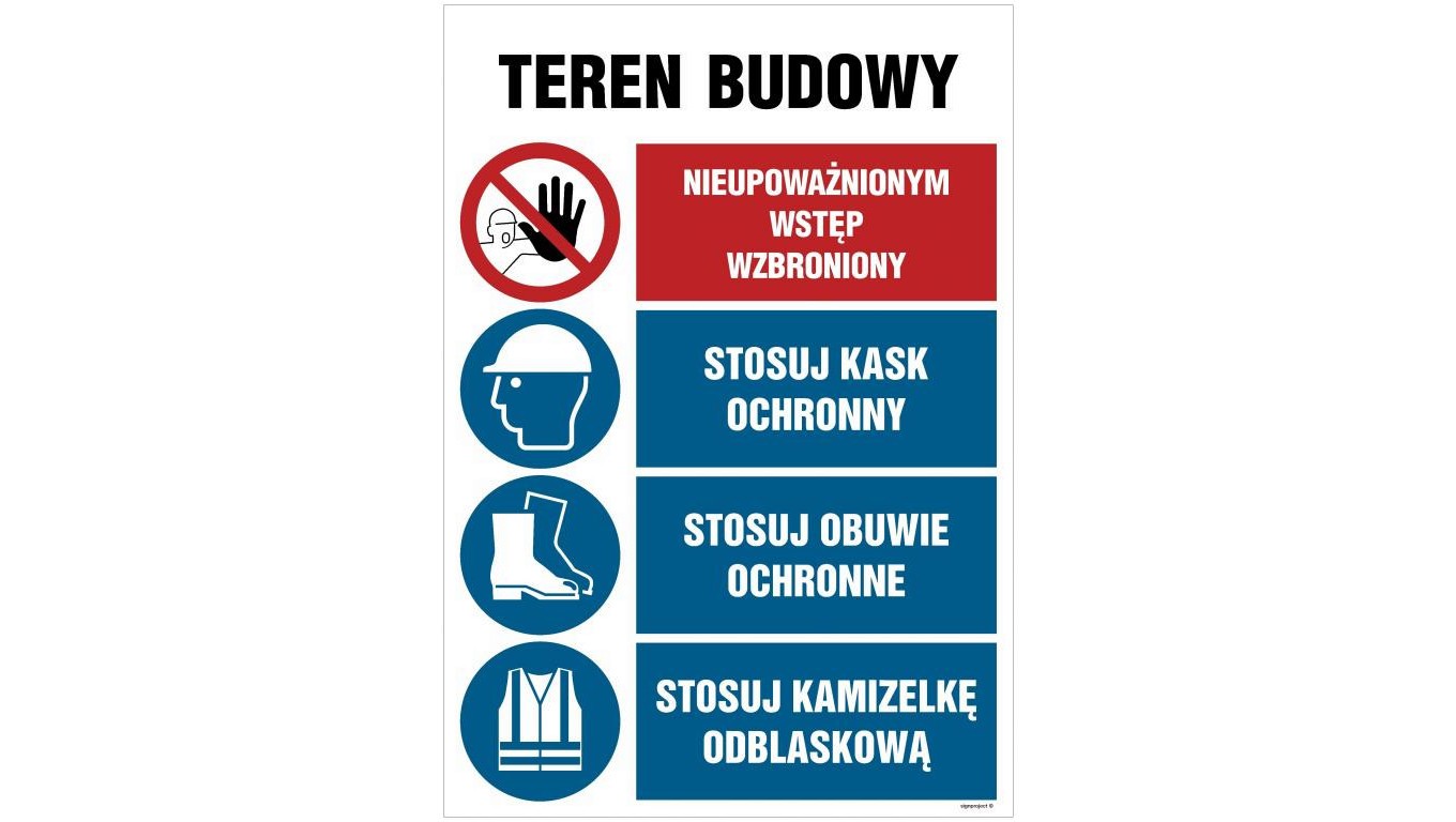 OI012 Teren budowy, Nieupoważnionym wstęp wzbroniony, Stosuj kask ochronny, Stosuj obuwie ochronne, Stosuj 70 x 105 cm PN - Płyt