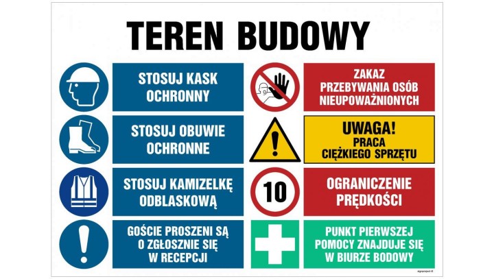 OI023 Teren budowy, Stosuj kask ochronny, Zakaz przebywania osób nieupoważnionych, Stosuj obuwie ochronne, 105 x 70 cm ON - Blac