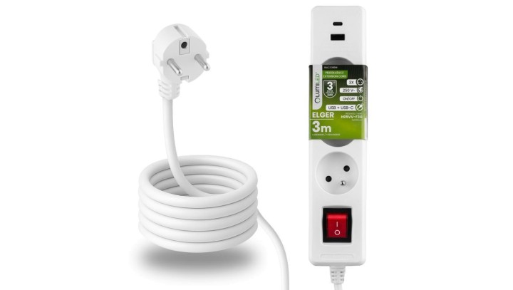 Przedłużacz Sieciowy Kabel z Uziemieniem Listwa Zasilająca 3 Gniazda 3m Włącznik ON/OFF Biały USB + USB-C Sznur ELGER Lumiled