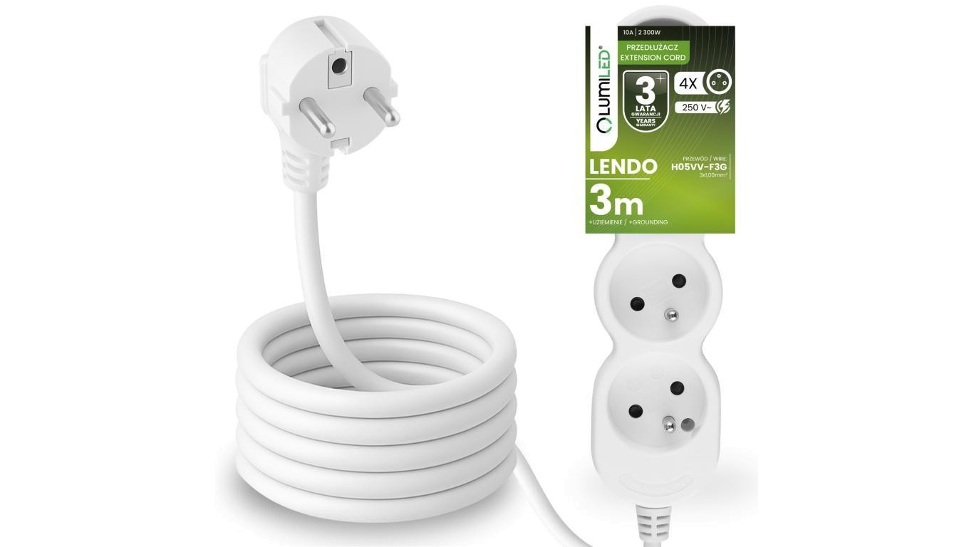 Przedłużacz Sieciowy Kabel z Uziemieniem Listwa Zasilająca 4 Gniazda 3m Biały Sznur Lendo Lumiled