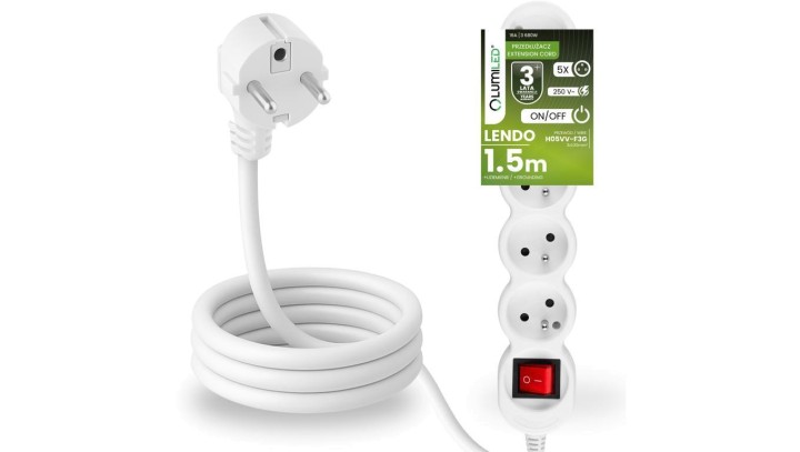 Przedłużacz Sieciowy Kabel z Uziemieniem Listwa Zasilająca 5 Gniazda 1.5m Włącznik ON/OFF Biały Sznur Lendo Lumiled