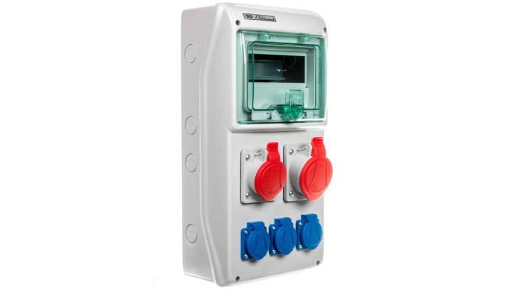 Rozdzielnica budowlana 8 modułow, 1x16A 5P 400V, 1x32A 5P 400V, 3x16A 2P+Z RSS-02 IP44 942020