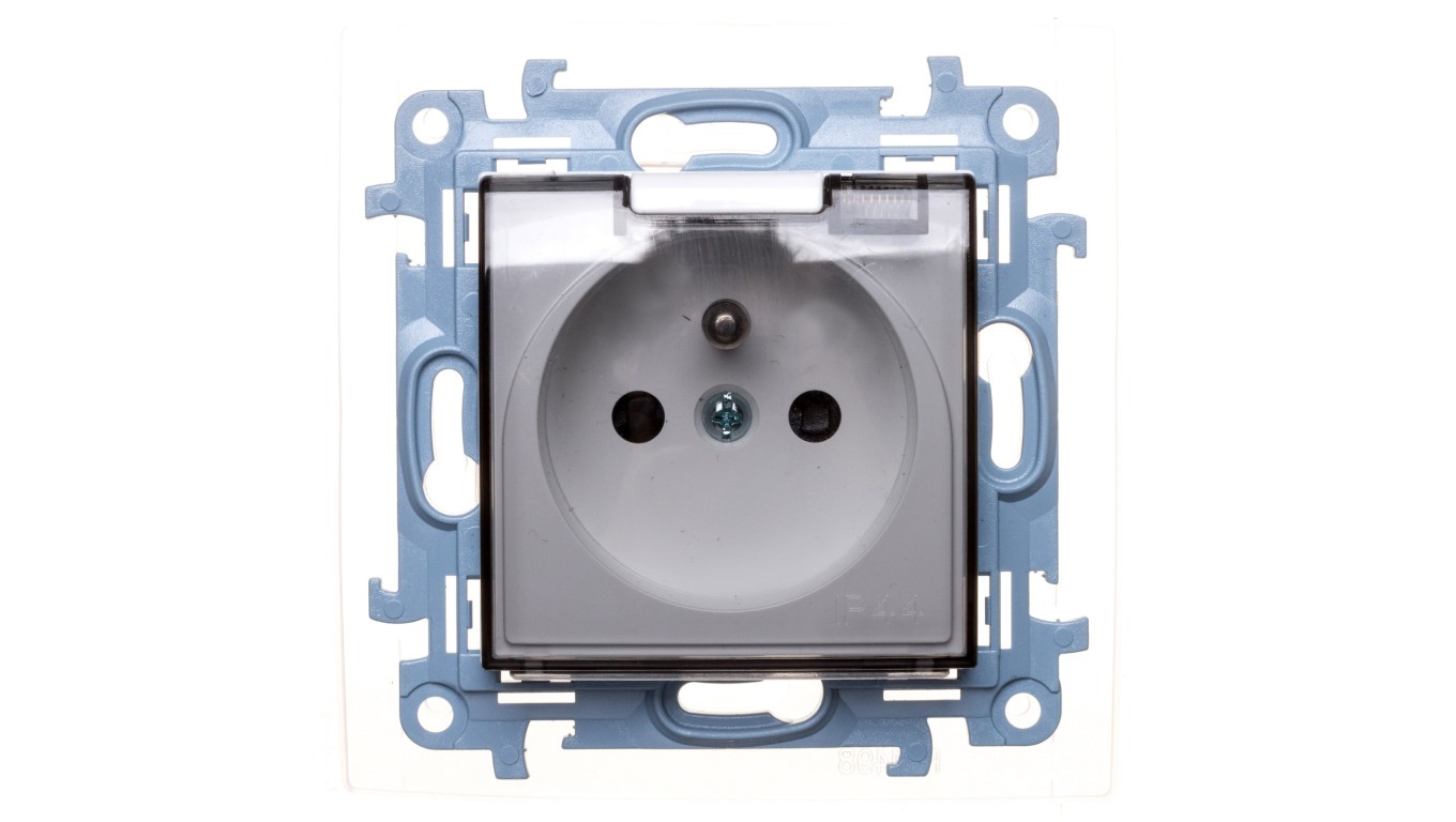 Simon 10 Gniazdo pojedyncze z uszczelką z przesłonami klapką transparetną białe 16A 250V IP44 CGZ1BZ.01/11A