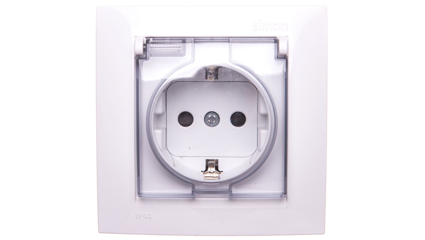 Simon 15 Gniazdo bryzgoszczelne z/u Schuko IP44 z klapką transparentą białe 1591450-030