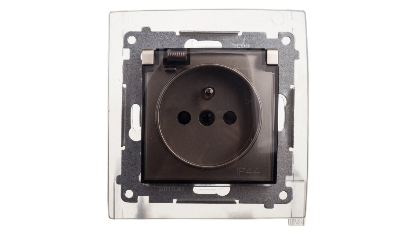 Simon 54 Gniazdo bryzgoszczelne z/u IP44 z klapką transparentną złoty mat DGZ1BZ.01/44A