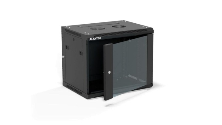 Szafa rack wisząca 19 cali 9U 600x450, drzwi szklane, tył i osłony boczne demontowalne, FLAT PACK kolor czarny ALANTEC