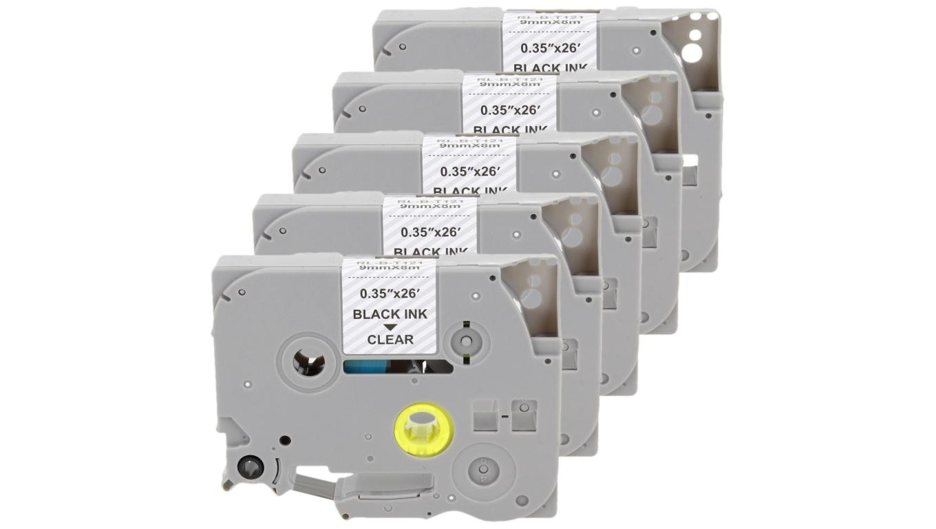 Taśma 5x Tze-121 do drukarki Brother 9mm 8m przeźroczysta taśma czarny nadruk