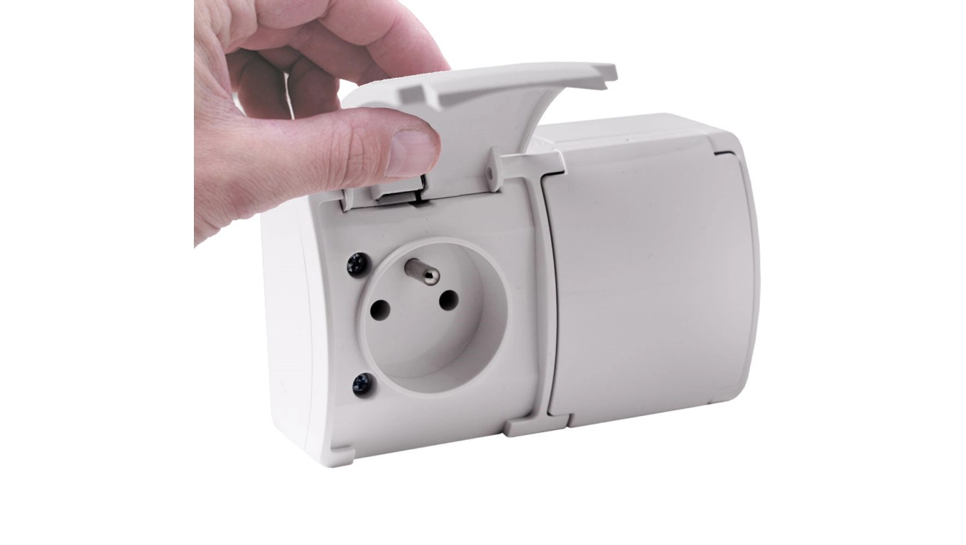 VIPLAST KOALA Gniazdo Podwójne Natynkowe z Białymi Klapkami z Uziemieniem Bolcem Białe Bryzgoszczelne