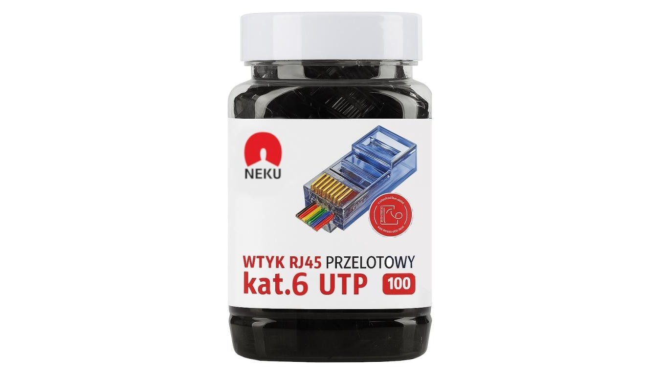 Wtyk modularny RJ45 8P8C kat.6 nieekranowany UTP uniwersalny drut linka przelotowy czarny NEKU opakowanie SŁOIK 100szt.
