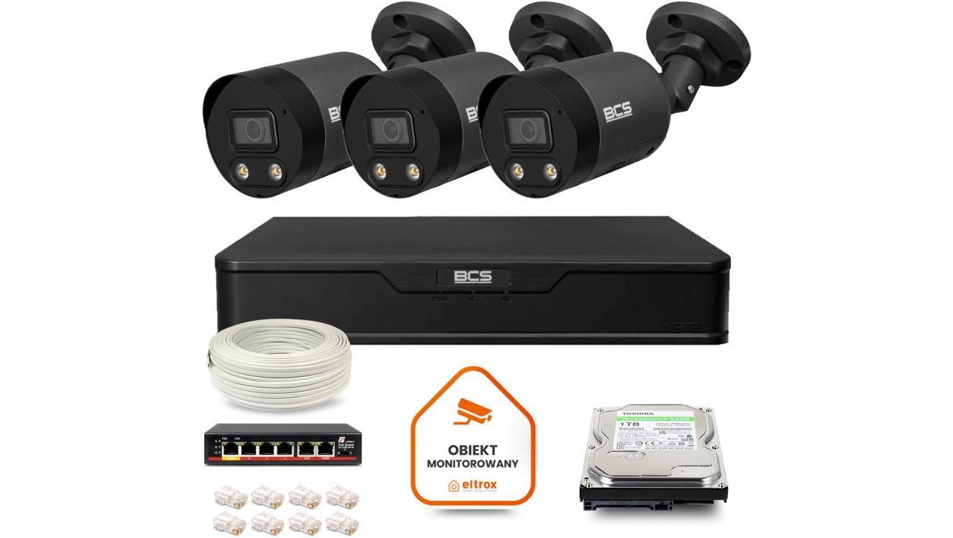 Zestaw monitoringu IP BCS Point 3x Kamera BCS-P-TIP28FWR3L2-Ai2-G Rejestrator z dyskiem 1TB