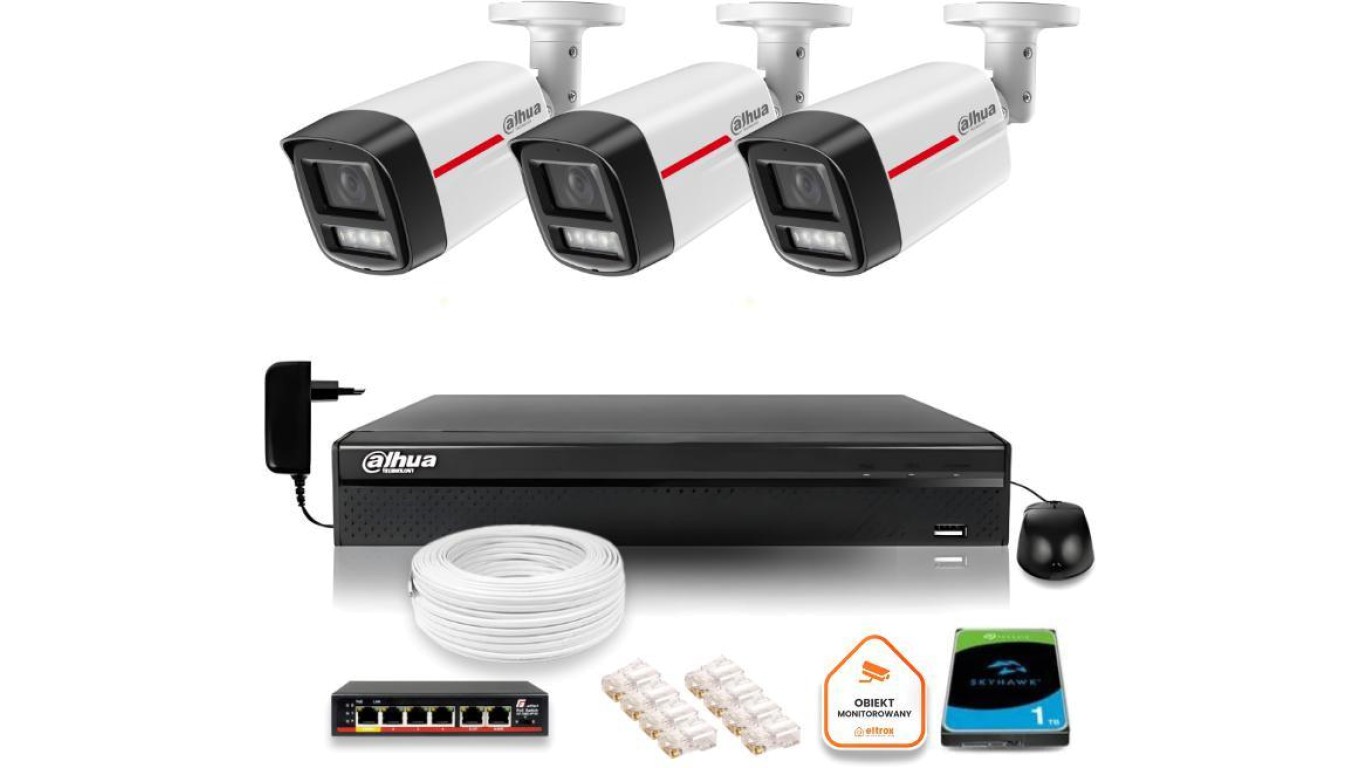 Zestaw monitoringu IP DAHUA 3 kamery zewnętrzne WizColor 2K 4MPx 50m