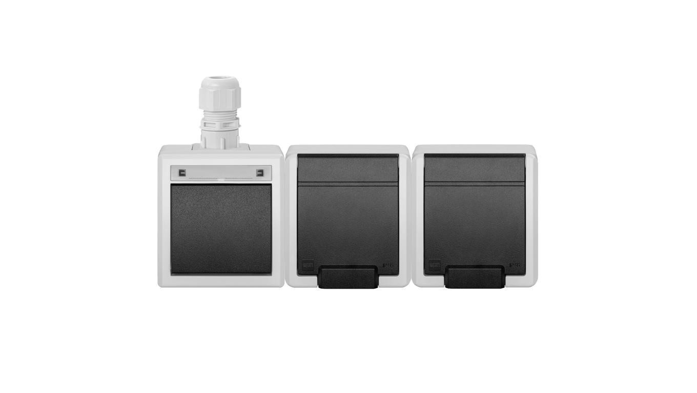 Zestaw poziomy gniazdo zasilające podwójne natynkowe hermetyczne IP65 szare z klapką 2x2P+Z + łącznik schodowy IP65 Aquant 2K